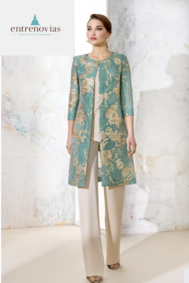 Pantalón y blusa con manga al codo y pluma en un lado cerca del hombro. Este conjunto sienta muy bien y el pantalón es de corte recto, las dos prenda están forradas.