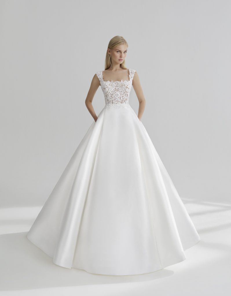 • La clásica: falda princesa en mikado con escote cuadrado impecable.
