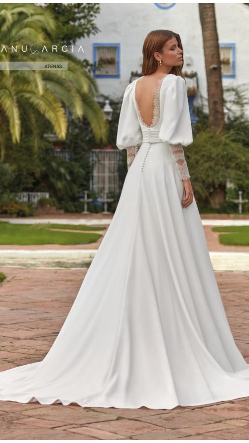 Vestido de novia confeccionado en crepe de alta calidad, perfecto para lucir elegante en cualquier ceremonia. Colección Higar Novias.