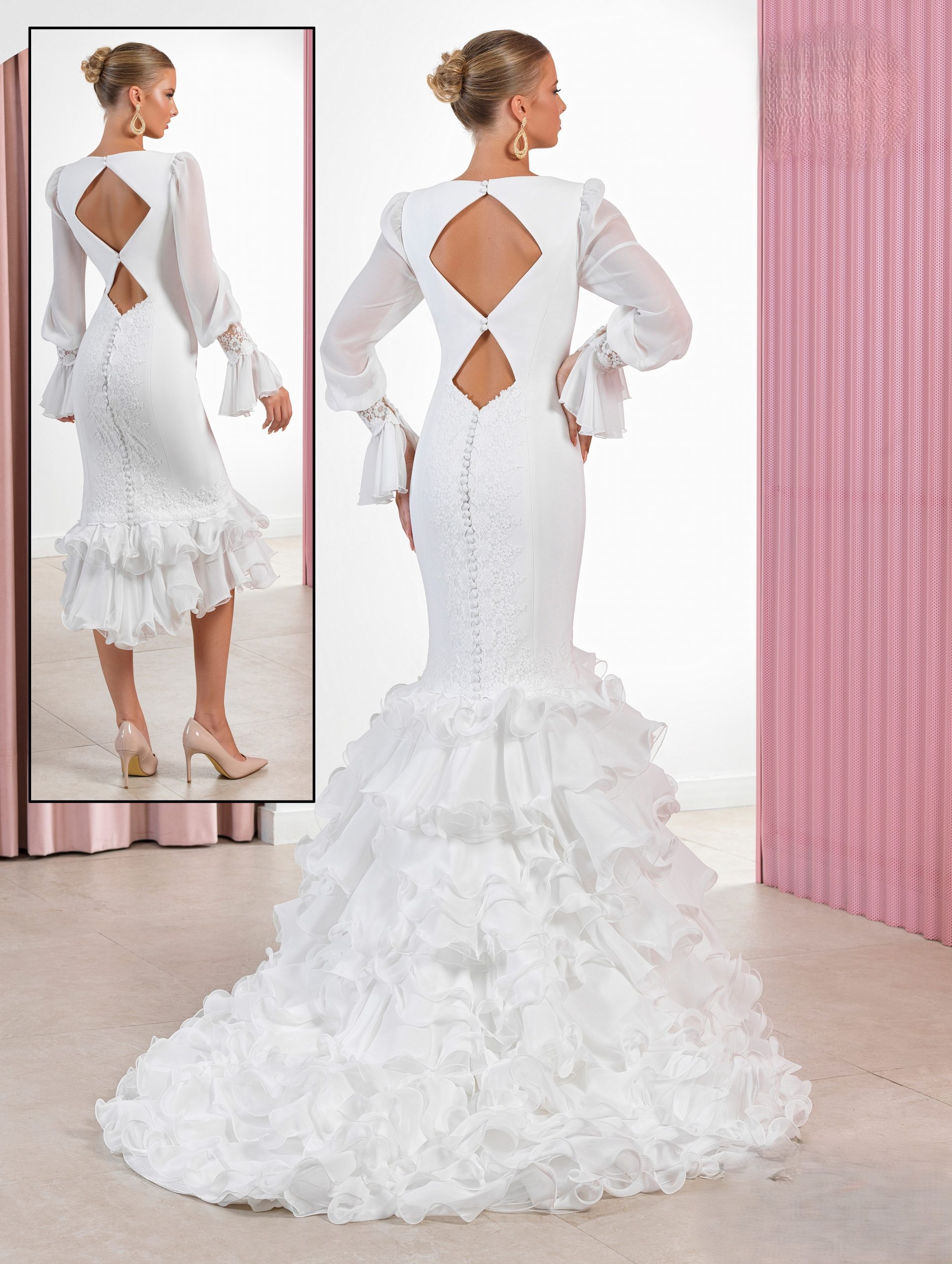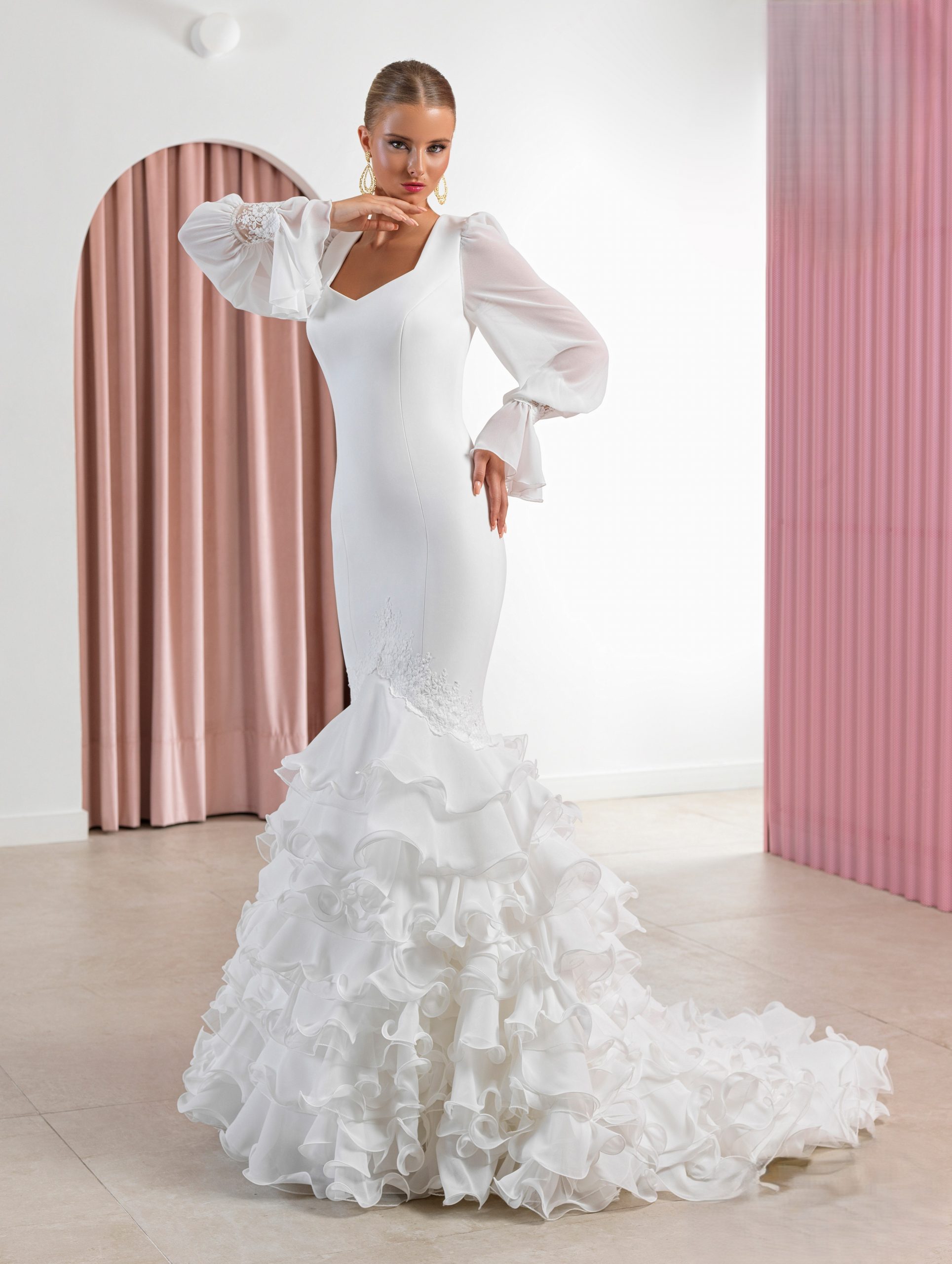 Vestido de novia de tirantes, su tejido es un delicado mikado, su estilo es flamenco con falda de volantes, su corte es sirena hasta la salida de los volantes,,vestido que hace lucir la silueta.