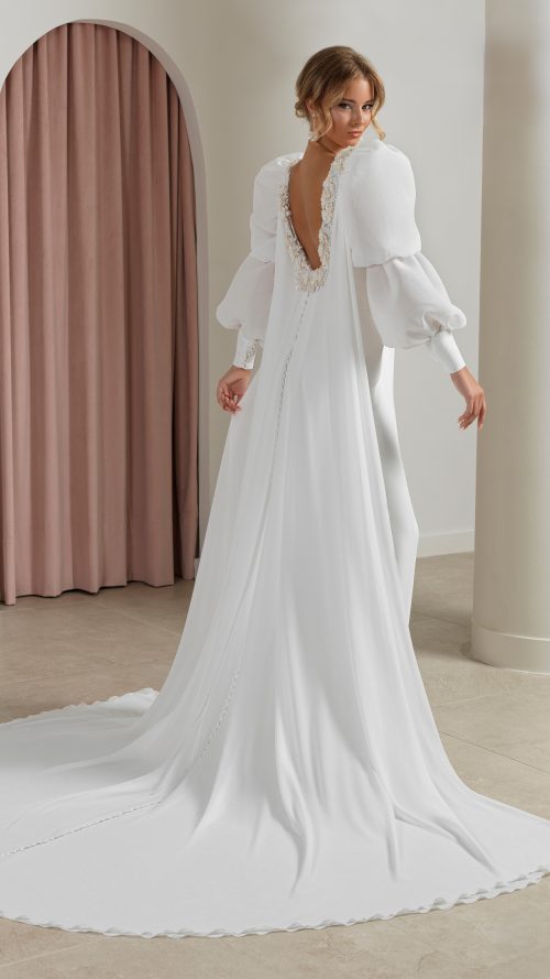 - ¿PUEDO PERSONALIZAR ESTE VESTIDO? Sí, según el modelo se pueden hacer variaciones en el largo de la cola, en el largo de las mangas y en la forma y/o profundidad del escote.