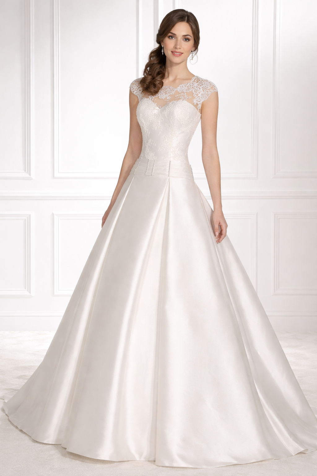 Vestido de novia corte recto falda de mikado y cuerpo de encaje sobre palabra de honor es de manga larga.