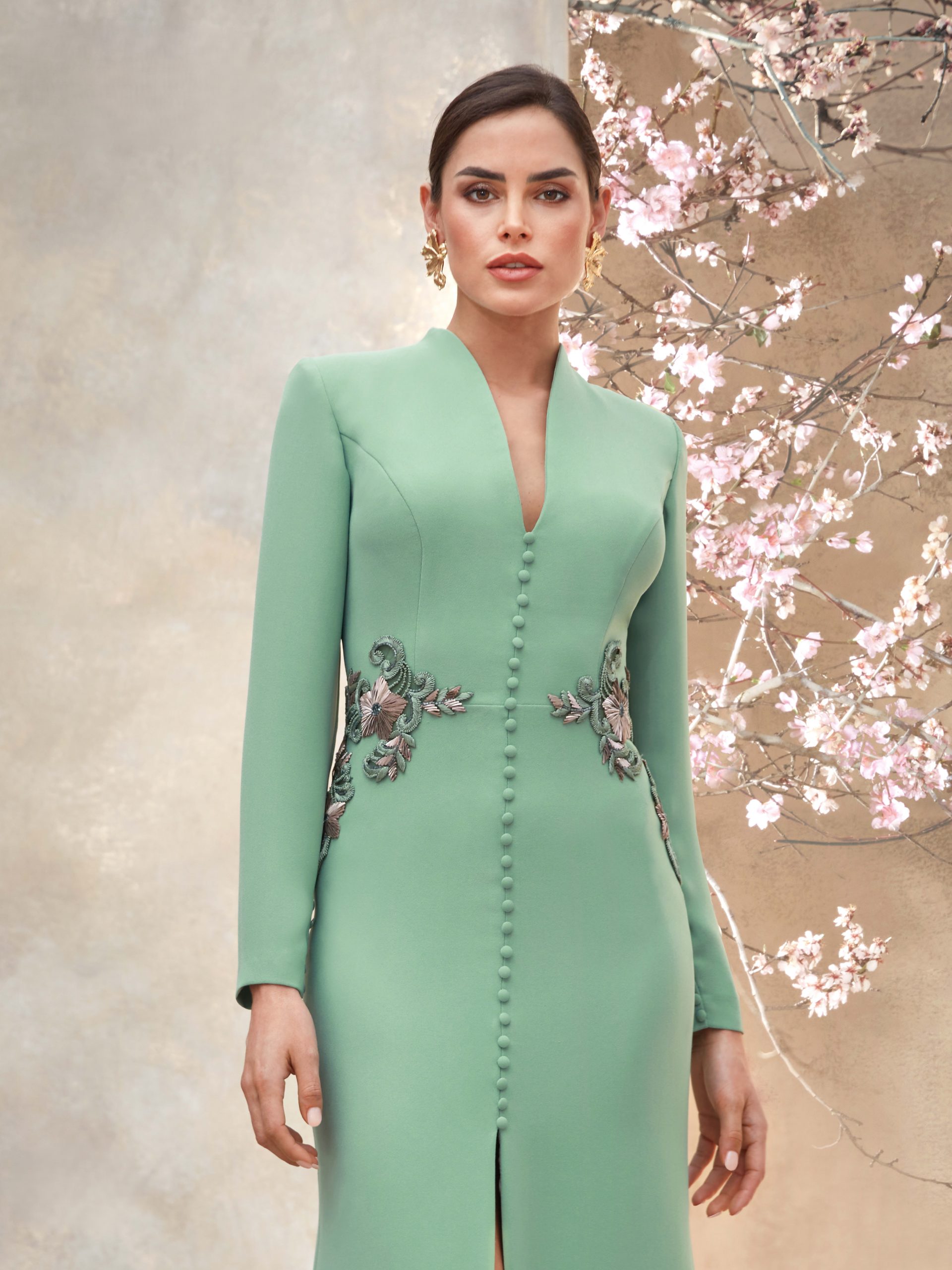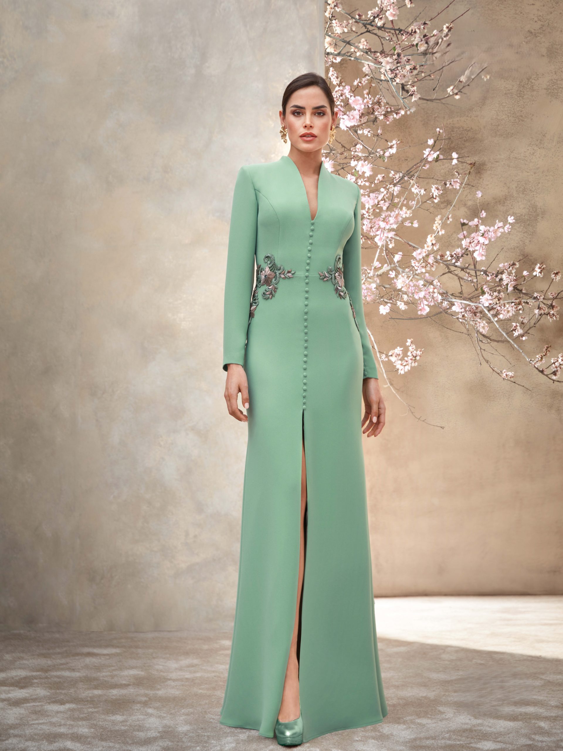 Vestido a medida de color verde suave ideal para madrina o madre de la novia.