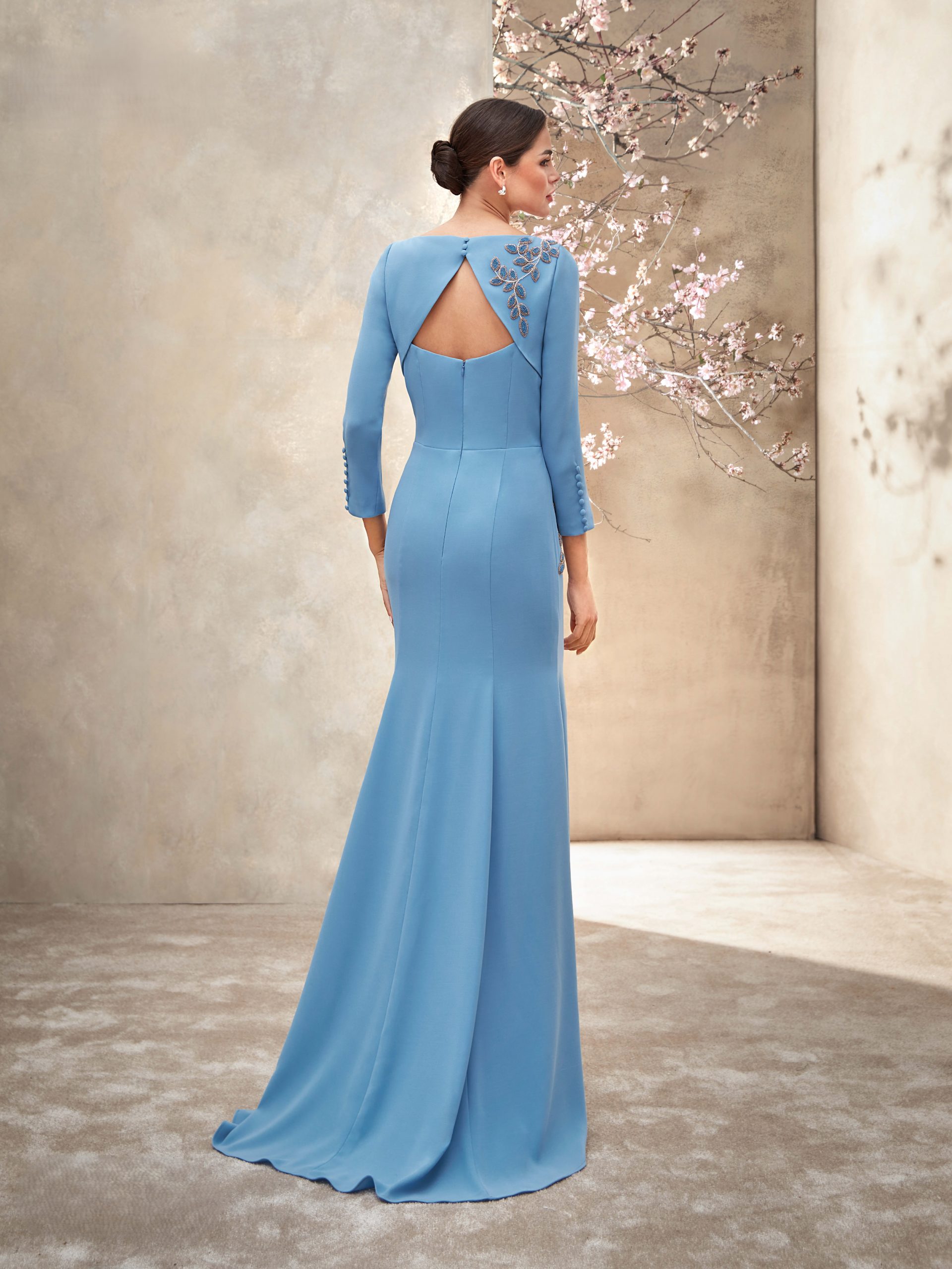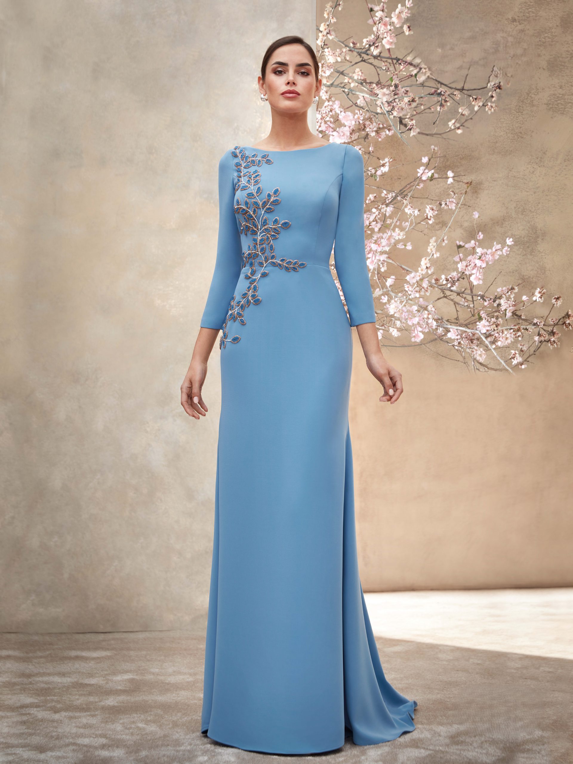 Vestido a medida de color azul suave ideal para madrina o madre de la novia.
