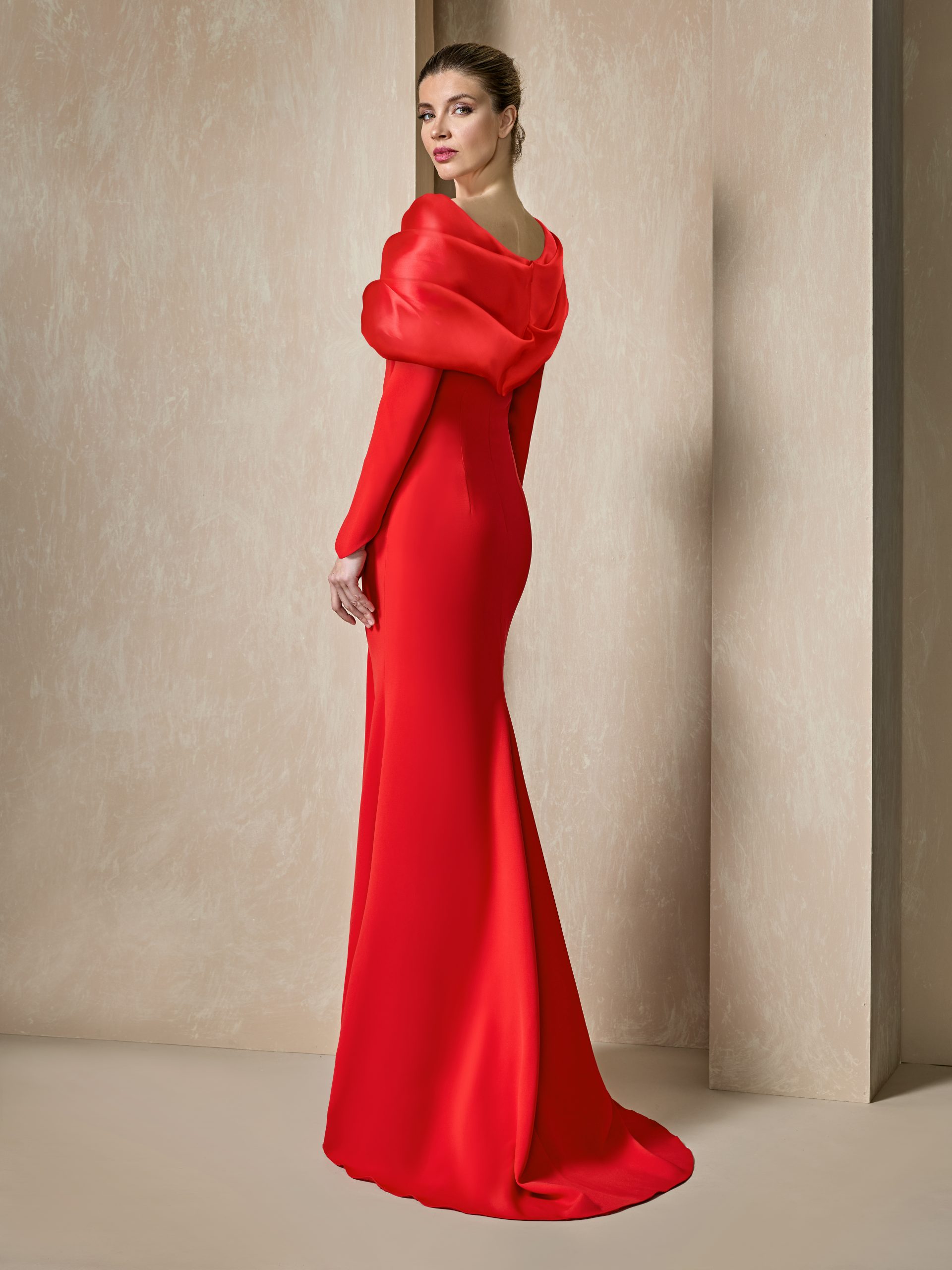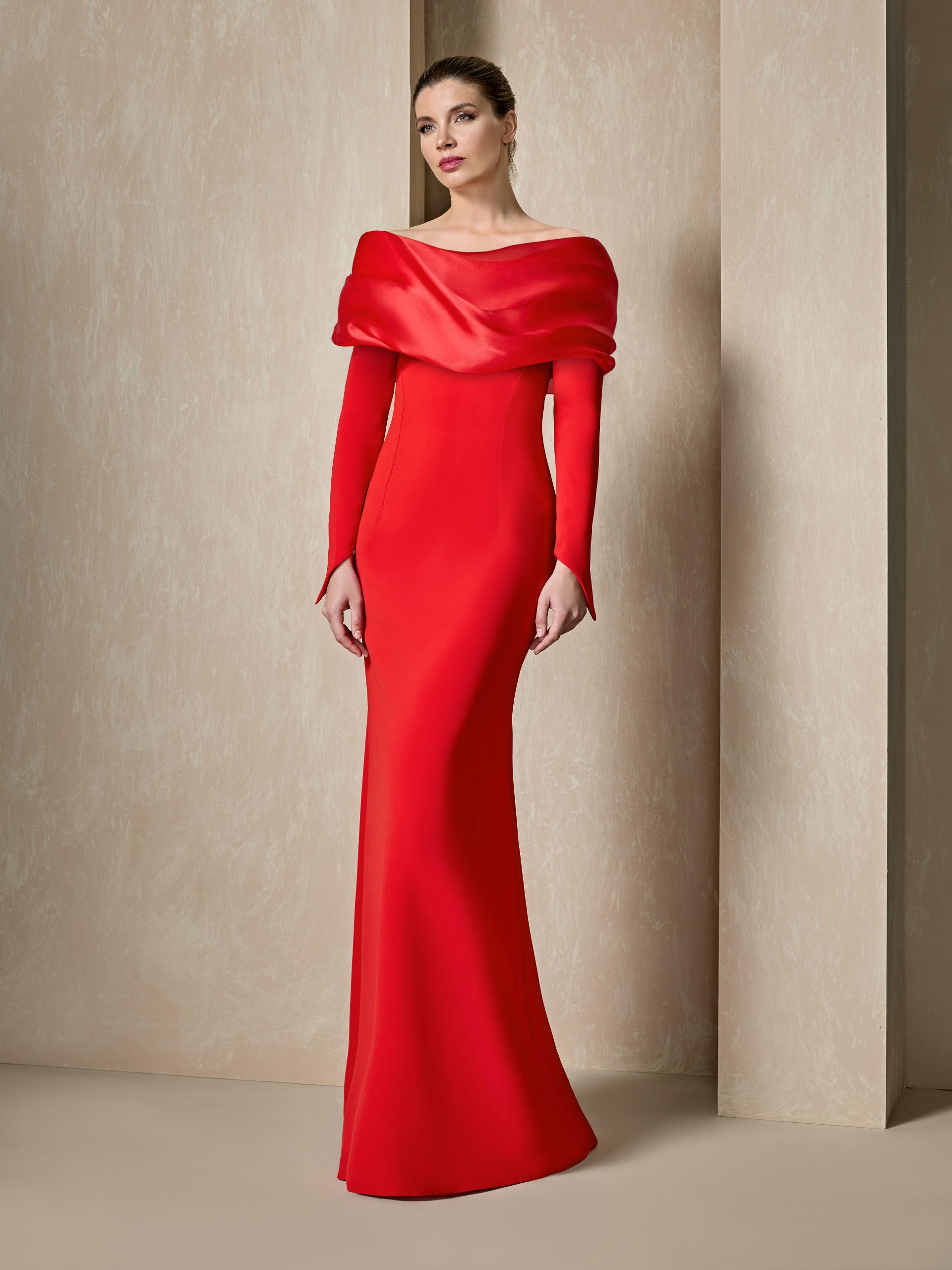 Vestido largo en color rojo con mangas y escote favorecedor