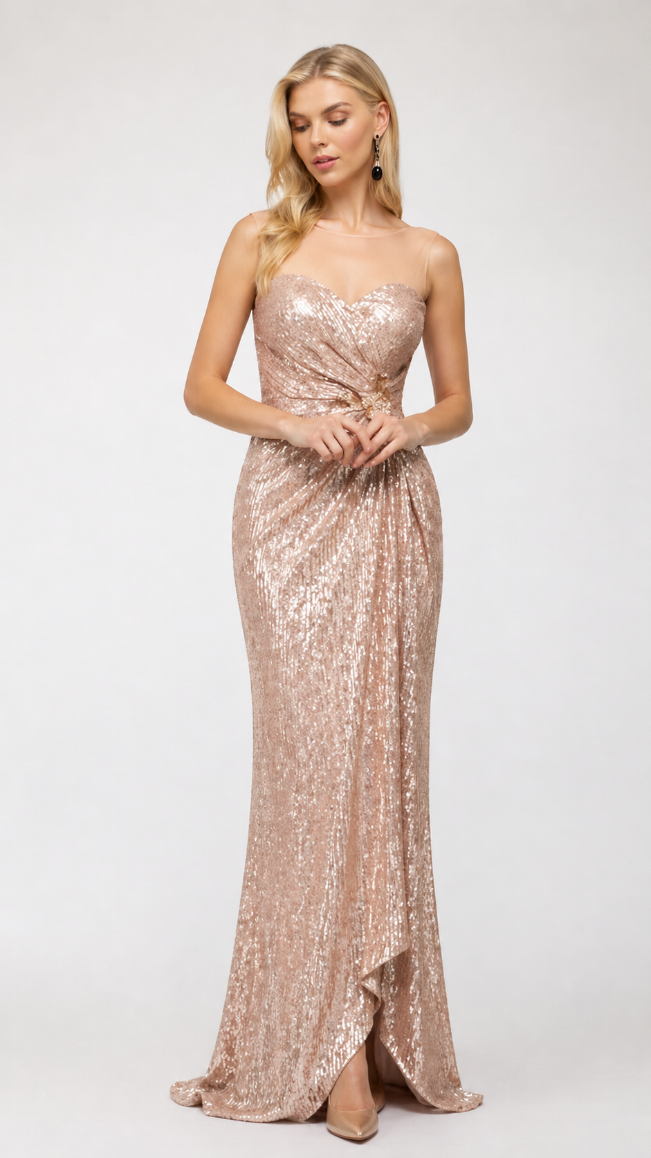 Vestido largo de lentejuela con escote corazón.
