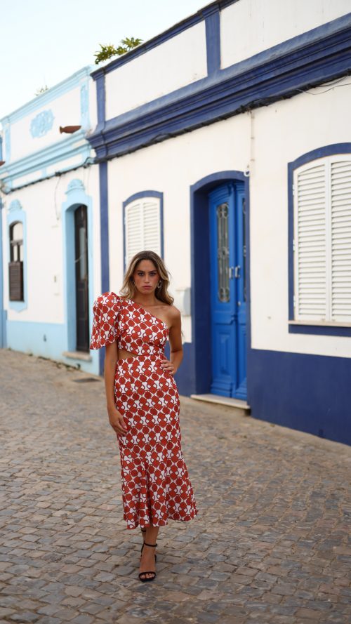 Vestido de invitada,estampado en colores rojos y naranjas.