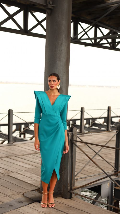 Vestido corto midi de invitada en crepé escote en «V» verde Andalucía.
