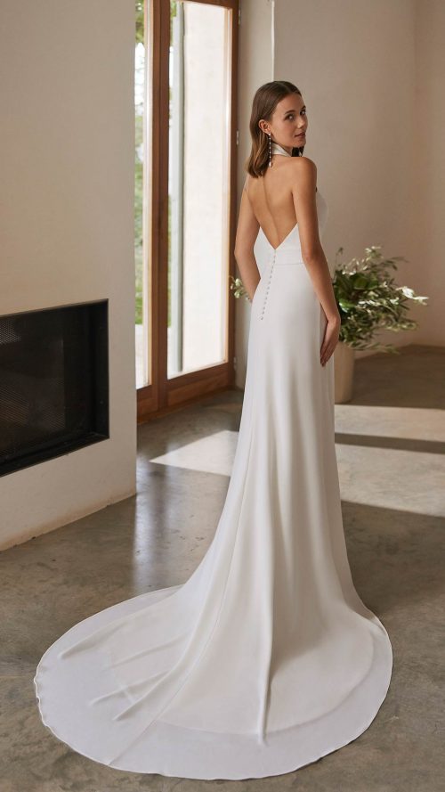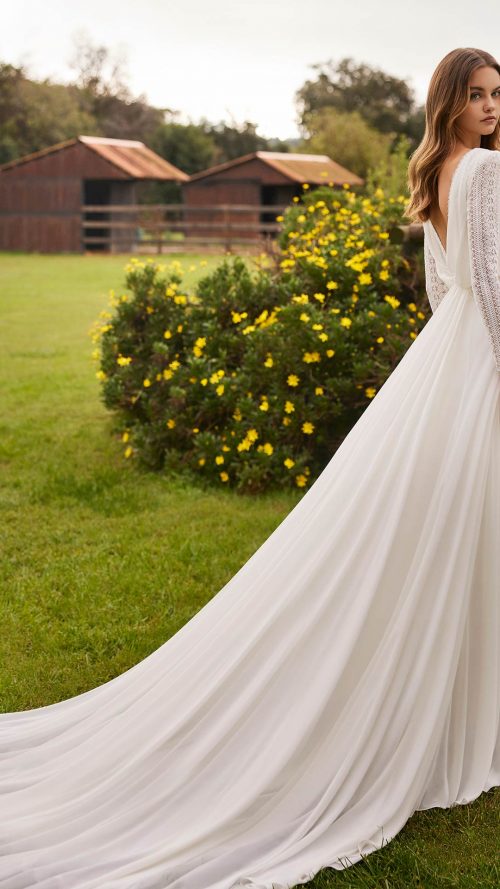 En Entrenovias te ofrecemos una selección cuidada de esta firma, donde cada vestido combina líneas suaves, escotes favorecedores y faldas con movimiento, confeccionados con tejidos como la gasa, el tul o el crepé. Encontrarás siluetas fluidas, cortes boho, volantes sutiles, espaldas abiertas y pequeños toques de encaje que hacen único cada diseño.
