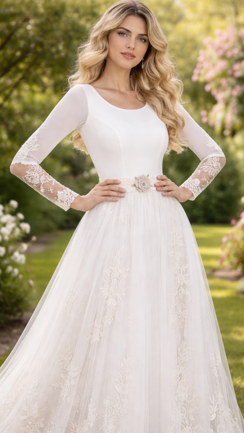 Vestido de novia corte sirena con escote y manga larga.